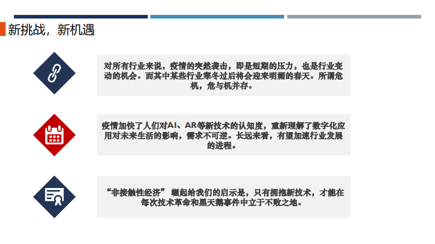 受疫情影响,以远程办公、物流快递、外卖服务等为代表的“非接触经济”等成为近一段时间的趋势,并将会继续维持“风口”效应,一并带来更多的机会和挑战。随着新技术的飞速发展,如今的“非接触经济”已经展现出成熟的一面,从研发到产品化再到商业落地,已然形成成熟的闭环。但“非接触经济”本身,还有很多值得探讨的内容等待我们的挖掘。
